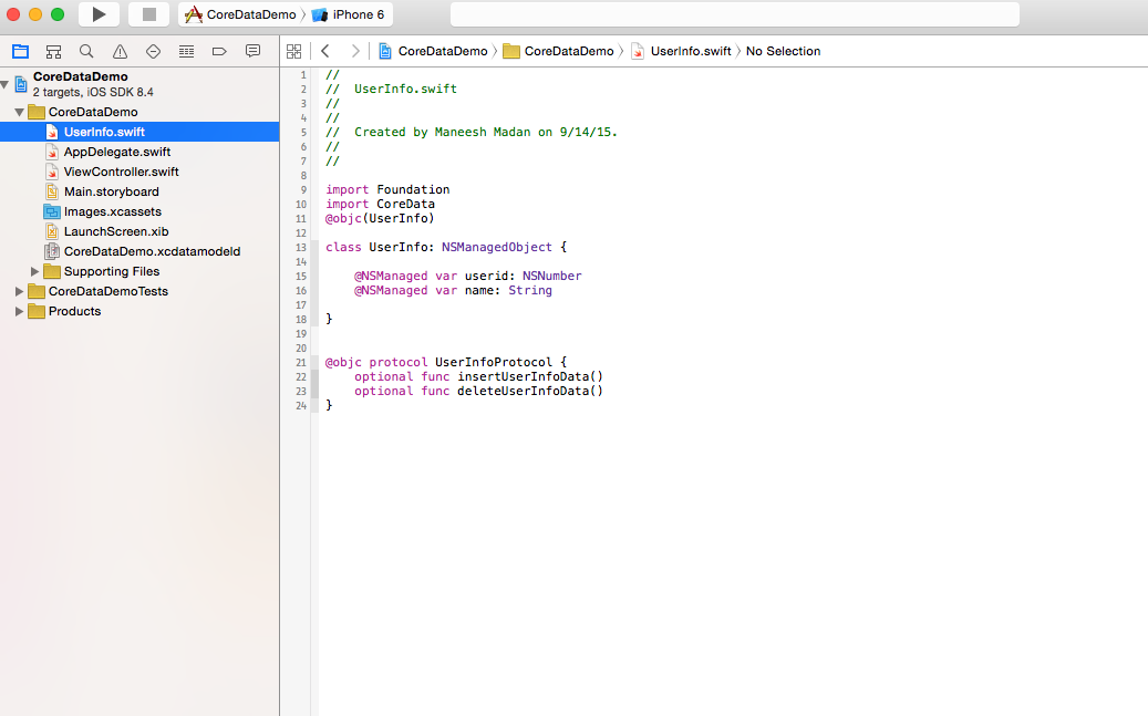 In the “UserInfo.swift” file that I created in my previous blog, make two protocols. One for inserting the data and the other to delete the data.